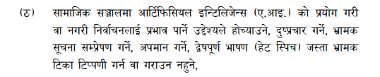 नयाँ आचारसंहिताको दफा ४ बमोजिम सामाजिक सञ्जालमा आर्टिफिसियल इन्टेलिजेन्सको प्रयोग गरी निर्वाचनलाई प्रतिकूल प्रभाव पार्ने, उम्मेदवारलाई होच्याउने, दुष्प्रचार गर्ने वा द्वेषपूर्ण भाषण गर्न नपाइने व्यवस्था गरिएको छ।