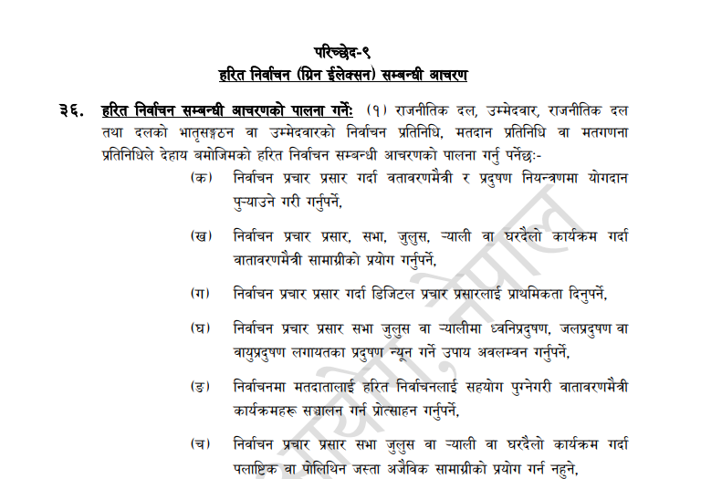 आचारसंहिताको परिच्छेद–९ अनुसार निर्वाचन प्रचारप्रसार गर्दा वातावरणमैत्री सामग्रीको प्रयोगलाई अनिवार्य गरिएको छ।