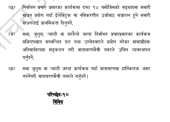 प्रचार सामग्रीलाई पुनः प्रयोग वा पुनः चक्रण गर्न सकिने बनाउनुपर्ने र प्रचारप्रसारमा डिजेल वा पेट्रोलबाट चल्ने सवारी साधनको सट्टा विद्युतीय सवारी साधनलाई प्राथमिकता दिनुपर्ने नियम बनाइएको छ।