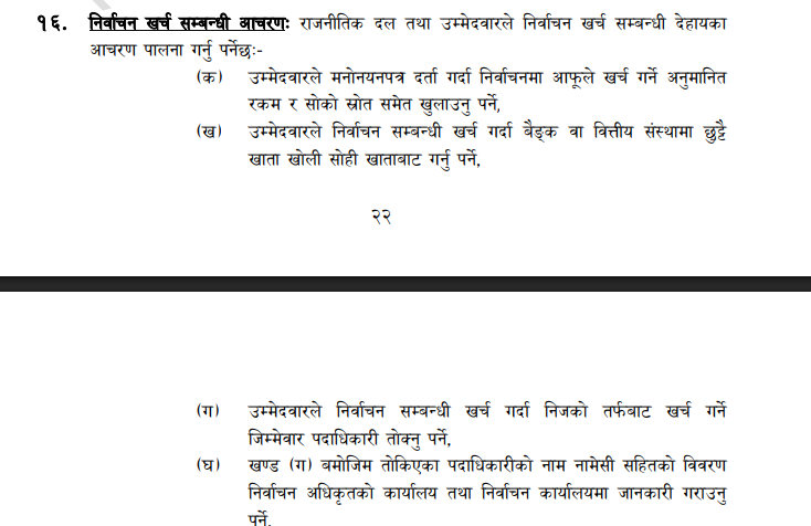 आचारसंहिताको दफा १६ अनुसार उम्मेदवारले मनोनयनपत्र दर्ता गर्दा नै आफूले गर्ने अनुमानित खर्च र त्यसको स्रोत अनिवार्य रूपमा खुलाउनुपर्नेछ।
