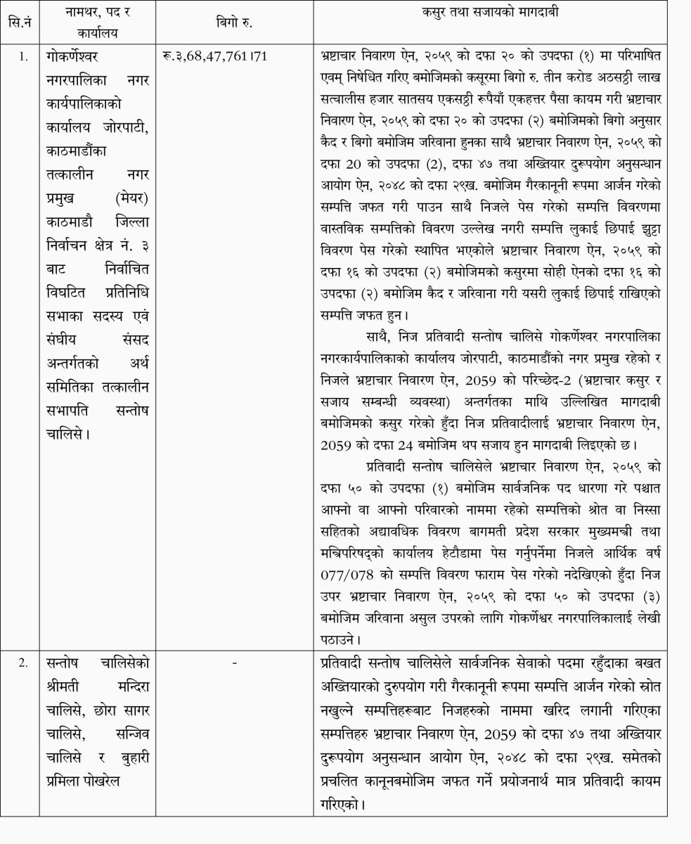 गोकर्णेश्वर नगरपालिकाका तत्कालीन नगर प्रमुखसमेत रहेका विघटित प्रतिनिधिसभा सदस्य चालिसेविरुद्ध अख्तियार दुरुपयोग अनुसन्धान आयोगले आइतबार विशेष अदालतमा तीन करोड ६८ लाख ४७ हजार ७ सय ६१ रुपैयाँ बिगो दाबीसहित मुद्दा दायर गरेको हो। उनी काठमाडौ जिल्ला निर्वाचन क्षेत्र नम्बर ३ बाट प्रत्यक्ष निर्वाचित सांसद् हुन्।
