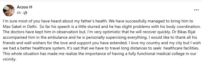 उनकी छोरी आर्जुले यसबारे जानकारी दिएकी हुन्। उनका अनुसार डाक्टर विकास रिजाल आफैँले सबै कुराको सुपरिवेक्षण गरिरहेका छन्।