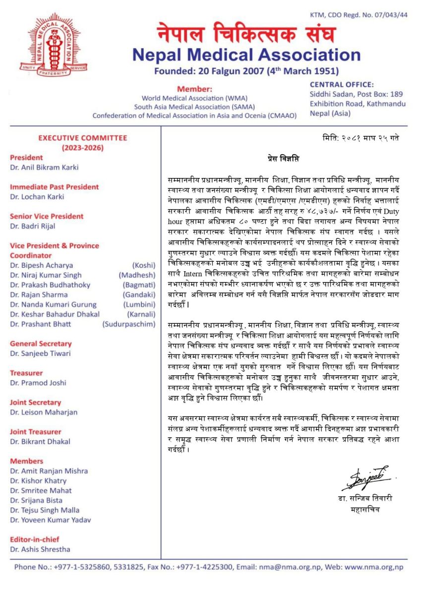 यसैबीच, नेपाल चिकित्सक संघले प्रधानमन्त्री केपी शर्मा ओलीको निर्णय स्वागत गरेको छ । शुक्रबार एक विज्ञप्ति जारी गर्दै संघले आवासीय चिकित्सकको तलब ४८ हजार ७३७ कायम गरिएको जनाएको हो ।