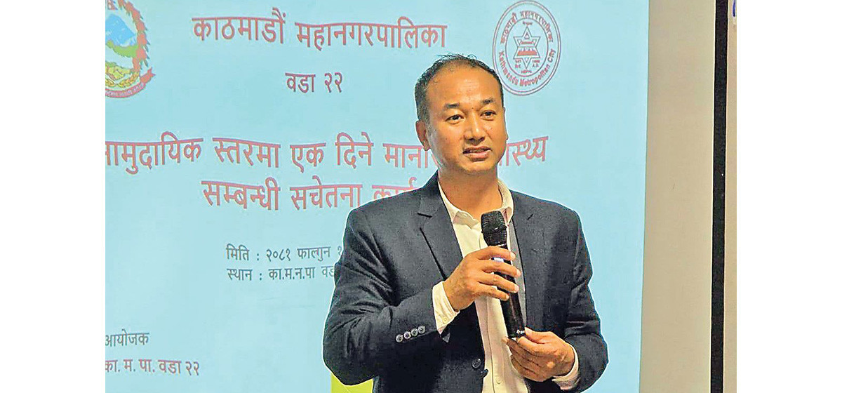 काठमाडौं महानगरपालिका वडा नं २२ ले बिहीबार ‘मानसिक स्वास्थ्य आजको आवश्यकता’ नाराका साथ एकदिने मानसिक स्वास्थ्य सचेतना कार्यक्रम आयोजना गरेको छ। सत्व माइन्ड क्लिनिकको सहकार्यमा आयोजित कार्यक्रममा मानसिक स्वास्थ्यका विविध पक्षबारे जानकारी दिइएको थियो।
