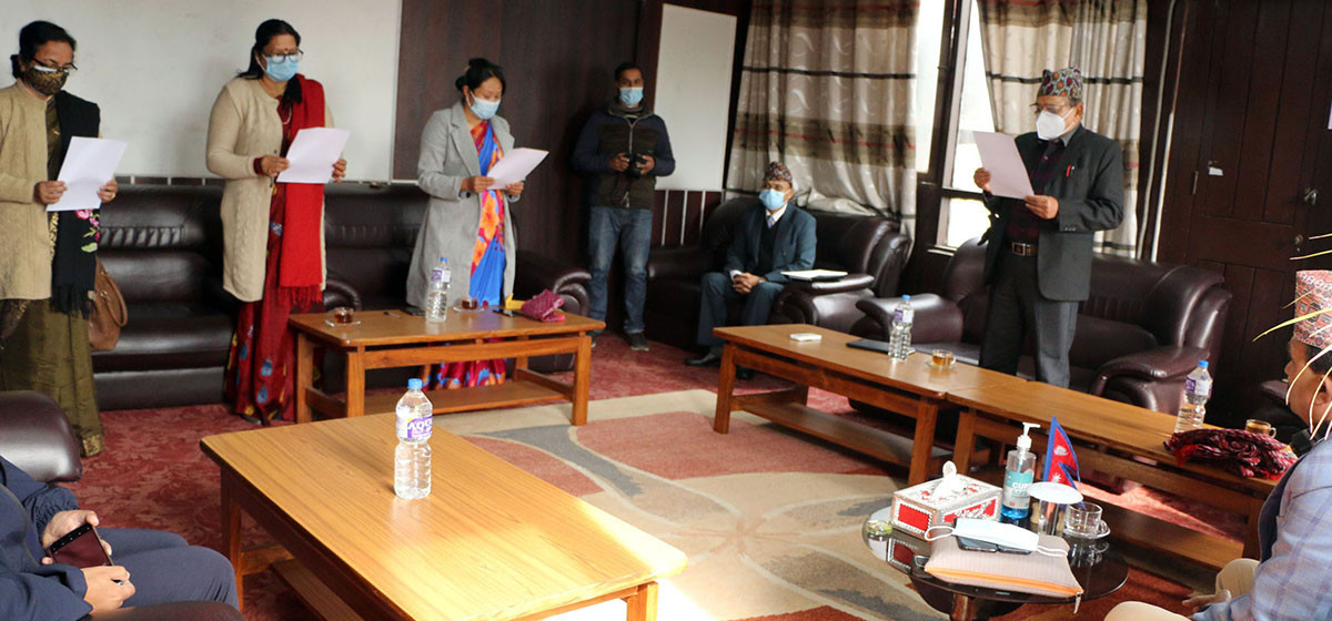 स्वास्थ्य बीमा बोर्डका नवनियुक्त पदाधिकारीले आज शपथ लिएका छन्। बोर्डका अध्यक्ष डा. सेनेन्द्र उप्रेतीले बोर्डका कार्यकारी निर्देशक डा. दामोदर बसौलासहित सदस्यहरु डा. तारा साह, इन्द्रकला राई र टीका चापागाईं भट्टराईलाई आज स्वास्थ्य तथा जनसङ्ख्यामन्त्री भानुभक्त ढकालको उपस्थितिमा शपथ गराएका हुन्।
