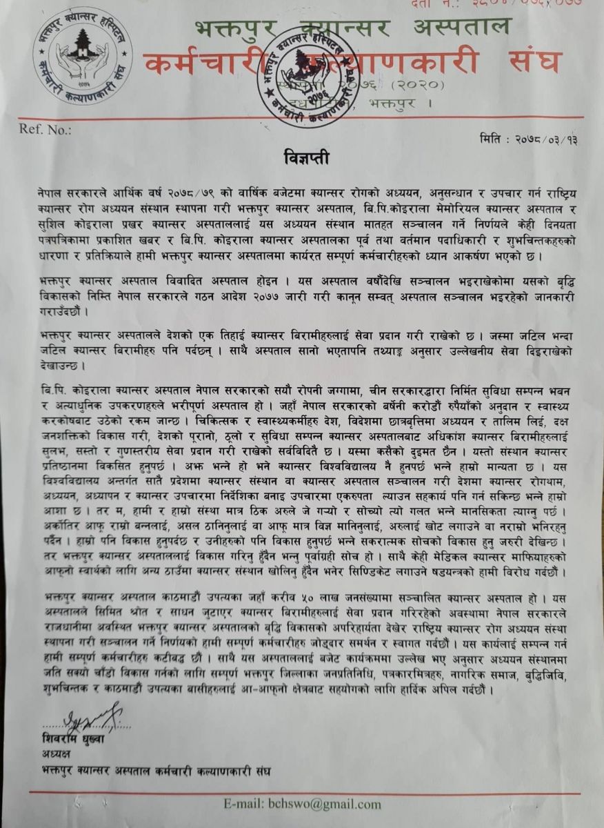 नेपाल सरकारले आर्थिक वर्ष २०७८/ ७९ को वार्षिक बजेटमा क्यान्सर रोगको अध्ययन, अनुसन्धान र उपचार गर्न राष्ट्रिय क्यान्सर रोग अध्ययन संस्थान स्थापना गरी भक्तपुर क्यान्सर अस्पताल, बि.पि.कोइराला मेमोरियल क्यान्सर अस्पताल र सुशिल कोइराला प्रखर क्यान्सर अस्पताललाई यस अध्ययन संस्थान मातहत सञ्चालन गर्ने निर्णय आफूहरुलाई उपयुक्त भएको भन्दै सो निर्णय कार्यान्वयन गर्न कर्मचारीहरुले माग गरेका छन्।