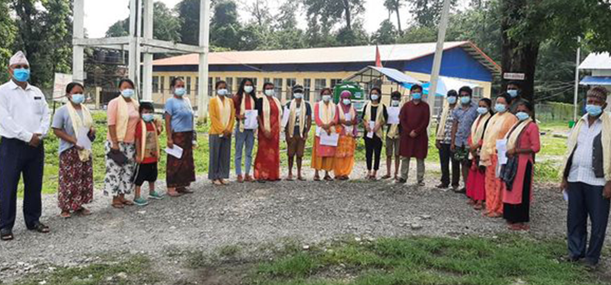चौदण्डीगढीमा बुधबार निको भएका संक्रमितलाई बिदाईपछि सामूहिक तस्बिर खिच्दै नगरप्रमुख खगेन्द्र राई। तस्बिरः महेश्वर