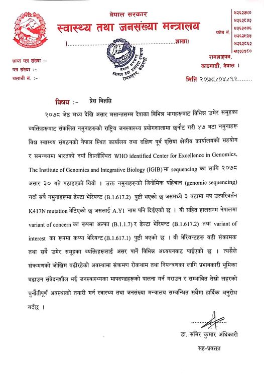 भाइरसको नयाँ उत्परिवर्तनसँगै जनस्वास्थ्यका मापदण्डलाई कडाइका साथ पालना गर्न समेत मन्त्रालयले आग्रह गरेको छ। मन्त्रालयले सम्भावित तेस्रो लहरको चुनौतिपूर्ण अवस्थाको तयारी गर्न पनि आग्रह गरेको छ।