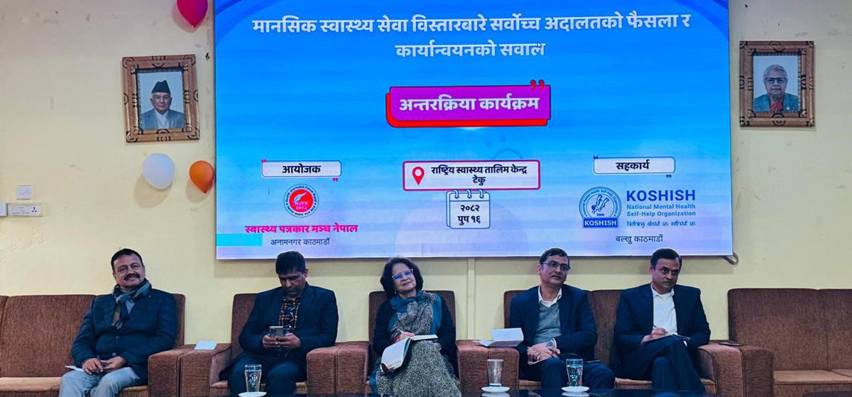 इपिडिमियोलोजी तथा सरुवा रोग नियन्त्रण महाशाखाको मानसिक स्वास्थ्य शाखाकी डा पोमा थापाले नेपालजस्तो अल्पविकसित मुलुकमा मानसिक स्वास्थ्य समस्या बन्दै गएको बताइन्। उनका अनुसार २५० जना मनोचिकित्सक रहे पनि ५० जना मात्र सरकारी अस्पतालमा रहेर सेवा दिइरहेको छ।