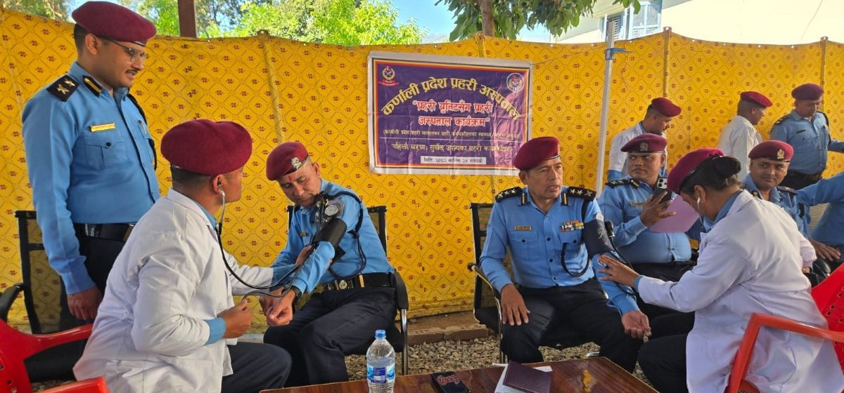 राजमार्ग सुरक्षा तथा जिल्ला ट्राफिक प्रहरी कार्यालयमा कार्यरत प्रहरीहरु, जिल्ला प्रहरी कार्यालयमा कार्यरत प्रहरीहरु, कर्णाली प्रदेश प्रहरी गण, कर्णाली प्रदेश प्रहरी कार्यालयमा कार्यरत प्रहरीहरुको स्वास्थ्य परिक्षण गरिएको जनाईएको छ । सुर्खेतपछि कर्णालीका विभिन्न जिल्लामा क्रमश स्वास्थ्य जाँचका कार्यक्रमहरु गरिने प्रहरी अस्पतालले जनाएको छ ।