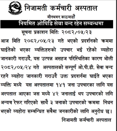 हिजो जेन-जीले गरेको प्रदर्शनका क्रममा घाइते भएका व्यक्तिहरूको उपचार भइरहेका कारण आज मंगलबार अस्पतालका सबै ओपीडी सेवाहरू बन्द गरिएका हुन्। आन्दोलनमा घाइते भएका व्यक्तिहरूलाई समयमा उपचार गराउने प्रयासमा अस्पताल लागि परिरहेको जनाएको छ।