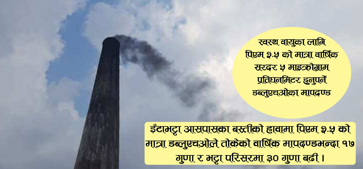 संघीय राजधानी रहेको काठमाडौं उपत्यकाभित्र सञ्चालनमा रहेका इँटाभट्टाबाट निस्कने वायु प्रदूषणले भट्टामा कार्यरत मजदुर र वरपरका बासिन्दाको स्वास्थ्यमा गम्भीर असर पारेको एक अध्ययनले देखाएको छ । वैज्ञानिक जर्नल ‘एट्मसफेरिक पोलुसन रिसर्च’मा गत साता प्रकाशित एक अध्ययन प्रतिवेदनले यस्तो देखाएको हो । अध्ययनले इँटाभट्टा आसपासका बस्तीको हावामा अत्यन्त ससाना कण (पिएम २.५) को मात्रा विश्व स्वास्थ्य संगठन (डब्लुएचओ) ले तोकेको वार्षिक मापदण्डभन्दा १७ गुणा र भट्टा परिसरमा ३० गुणा बढी रहेको देखाएको छ । अध्ययनले अध्ययनले इँटाभट्टाले वायु प्रदूषण बढाउने र त्यसले मानव स्वास्थ्यमा गम्भीर असर पार्ने तथ्यलाई थप पुष्टि गरेको छ ।