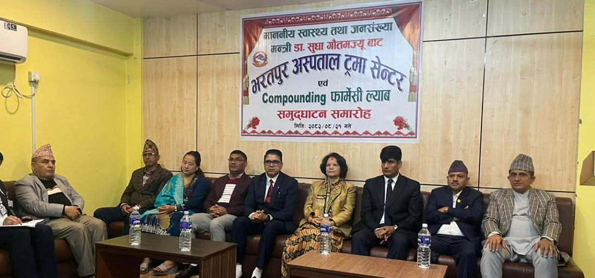 स्वास्थ्य तथा जनसंख्यामन्त्री डा सुधा शर्मा गौतमले आज भरतपुर अस्पताल चितवनमा नवनिर्मित ट्रमा सेन्टर र कम्पाउन्डिङ फार्मेसी ल्याबको समुद्घाटन गरेकी छन्।