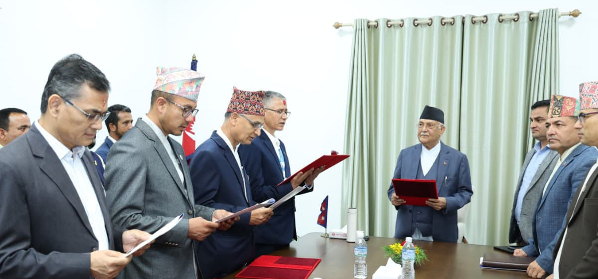 प्रधानमन्त्री एवं कुलपति केपी शर्मा ओलीसमक्ष विभिन्न चार स्वास्थ्य विज्ञान प्रतिष्ठानका नवनियुक्त उपकुलपतिहरूले आज पद तथा गोपनीयताको शपथ लिएका छन्।
