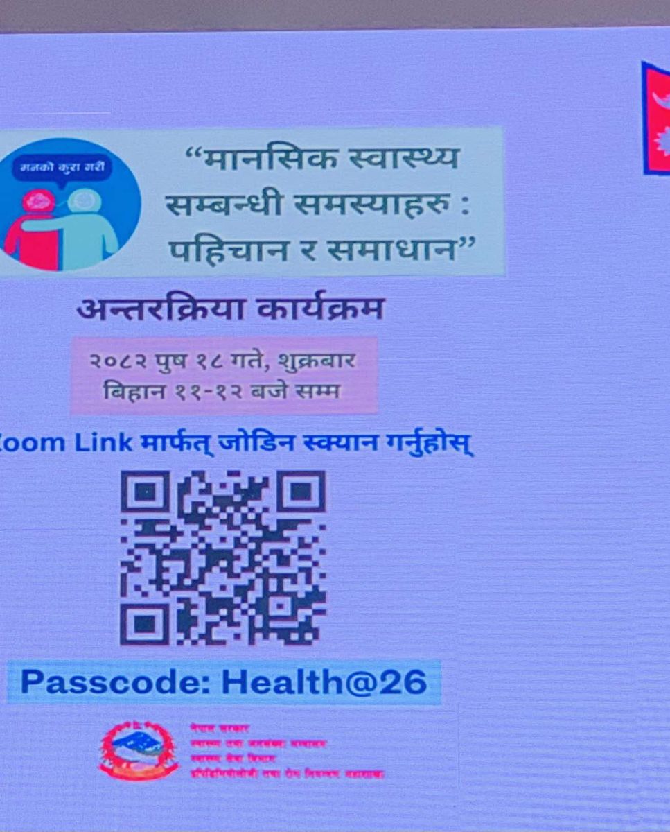 कार्यक्रममा स्वास्थ्य तथा जनसङ्ख्या मन्त्री डा. सुधा गौतम शर्माले स्वागत मन्तव्य राख्ने र विषयविज्ञहरूले मानसिक स्वास्थ्यसम्बन्धी प्रस्तुति दिने तालिका रहेको डा. थापाले जानकारी दिए।