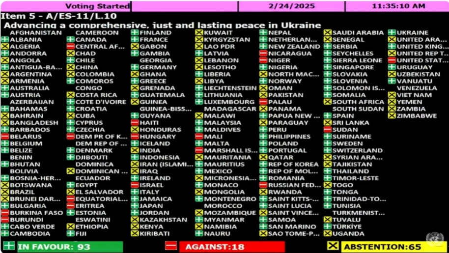 यो प्रस्तावकाे पक्षमा ९३ मुलुकले समर्थन गरे, १८ ले विराेध र ६५ ले भाग लिएनन्। यो मतदानले विश्व राजनीतिमा गहिरो विभाजन देखाएको छ, जसले प्रमुख शक्तिहरूको भूमिका र तटस्थ मुलुकहरूको रणनीतिलाई उजागर गरेको छ।