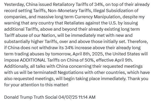 यसैबीच, चीनले ट्रम्पको नयाँ धम्कीलाई ‘गल्ती माथिको गल्ती’ भन्दै कडा जवाफ फर्काएको छ। चीनको वाणिज्य मन्त्रालयले अमेरिकाको ‘ब्ल्याकमेल प्रकृति’ स्वीकार्य नभएको भन्दै अन्तिमसम्म यसविरुद्ध लड्ने प्रतिबद्धता जनाएको छ। मन्त्रालयले ट्रम्पलाई ५० प्रतिशत करको धम्की फिर्ता लिएर वार्ताबाट मतभेद समाधान गर्न आह्वान पनि गरेको छ। एजेन्सी