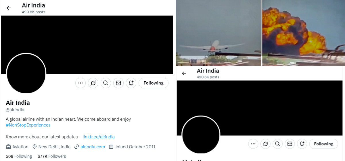 गुजरातमा विमान भयानक दुर्घटनामा परेपछि एयर इन्डियाले आफ्नो सामाजिक सञ्जाल(फेसबुक र एक्स)का पेजमा ‘ब्ल्याक आउट’ गरेको छ। घटनाप्रति दुःख जनाउँदै एयर इन्डियाले फेसबुक र एक्स पेजका प्रोफाइल र कभर तस्बिर हटाएर कालो तस्बिर राखेको हो।