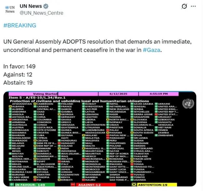 शुक्रबार संयुक्त राष्ट्र संघको महासभामा गाजामा तत्काल बिनासर्त र स्थायी युद्धविरामको माग गर्दै एक प्रस्ताव प्रस्तुत गरिएको थियो। यसले गाजामा बन्धक बनाइएका सबै मानिसहरूलाई तत्काल र बिनासर्त रिहा गर्न पनि माग गरेको थियो।