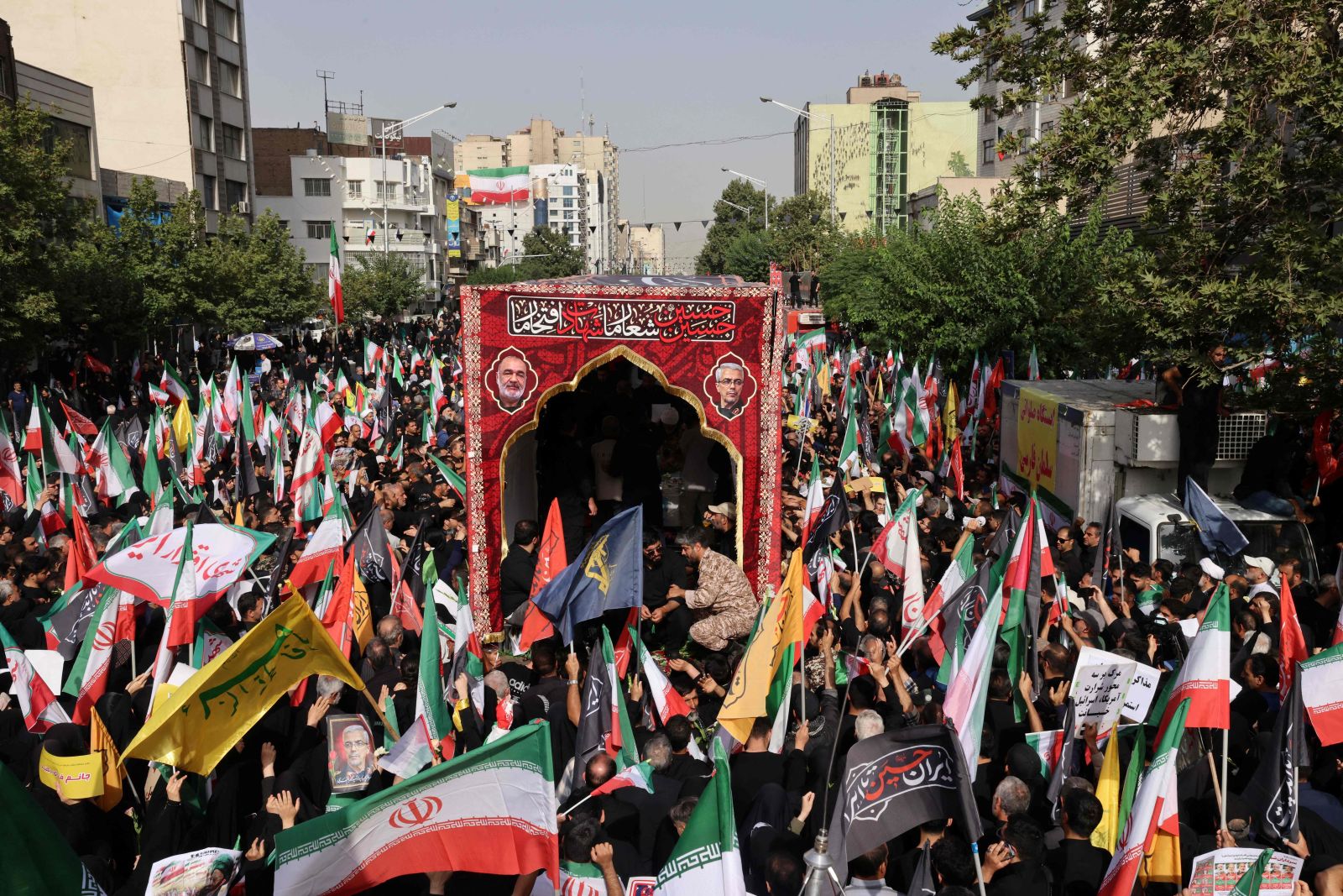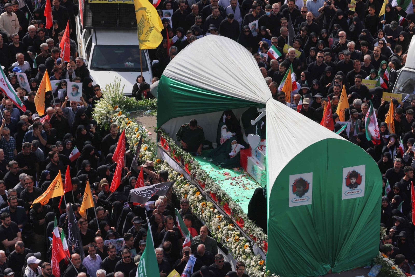 अन्त्येष्टिमा सहभागी हुन आएकाहरूको नाराबाजी गर्दै इरानी झण्डा फहराएका थिए र मारिएकाहरूको तस्बिर बोकेका थिए।