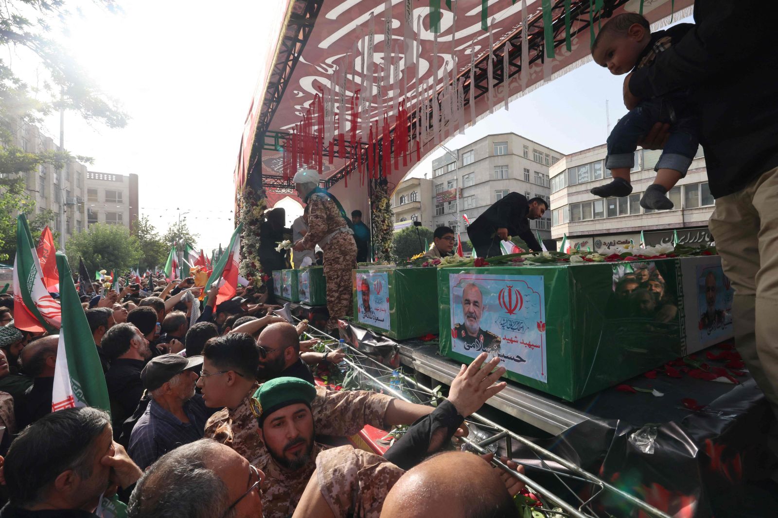 शनिबार तेहरानको एङ्गेलाब स्क्वायर नजिकै इरानी झण्डाले बेरिएका र मृतक कमान्डरहरूको तस्बिर राखिएका कफिनहरूको वरिपरि ठूलो भीड जम्मा भएको थियो।