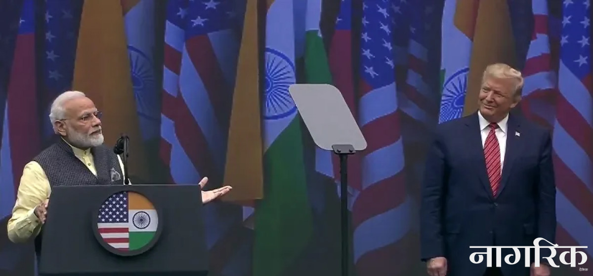 अमेरिका- अमेरिकी राष्ट्रपति डोनाल्ड ट्रम्प र भारतीय प्रधानमन्त्री नरेन्द्र माेदीको 'दुर्लभ संयुक्त कार्यक्रम'मा दशौं हजार भारतीय मूलका अमेरिकीहरू सहभागी भएका छन्। टेक्सस राज्यको ह्युस्टनमा आयोजित गरिएको कार्यक्रममा दुवै नेताले सम्बोधन गरे। आयोजकहरूले अमेरिकामा पोपबाहेक अन्य विदेशी नेतालाई गरिएको त्यो नै अहिलेसम्मको सबैभन्दा भव्य स्वागत भएको बताएका छन्।