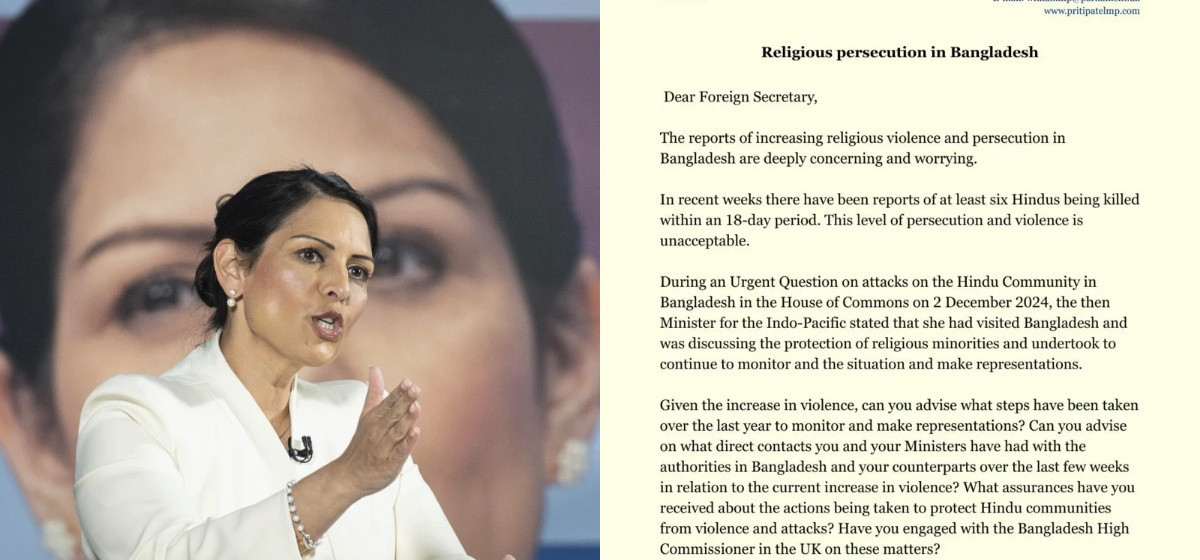 ब्रिटिश कन्जरभेटिभ पार्टीकी सदस्य तथा पूर्व गृहमन्त्री प्रीति पटेलले बंगलादेशको वर्तमान अवस्थाप्रति गम्भीर चिन्ता व्यक्त गर्दै बेलायती विदेश सचिव इभेट कूपरलाई पत्र लेखेकी छन्।