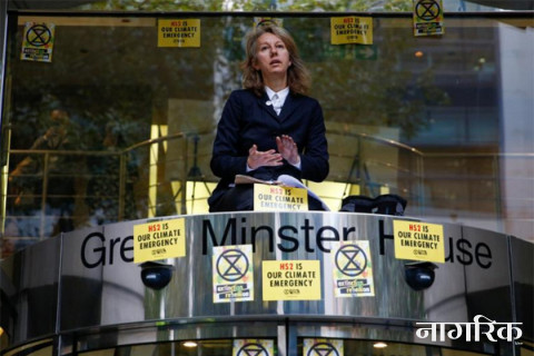 ‘एक्सटिङ्सन रेबेल्यिन’ आन्दोलन वा समूहका एकजना संस्थापकसहित जलवायु परिवर्तनसम्बन्धी अभियन्ताले मंगलबार प्रहरी प्रतिबन्धको वेवास्ता गर्दै बेलायतको यातायात मन्त्रालय र सुरक्षा एजेन्सी एम आई फाइभलाई लक्षित गर्दै प्रदर्शन गरेको हुन्।