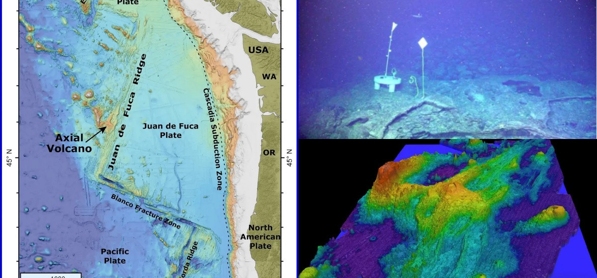 एक्सियल सीमाउन्ट जुआन डे फुका रिजमा अवस्थित छ, जुन अमेरिकी प्रशान्त उत्तरपश्चिम तटबाट एक भिन्न प्लेट सीमा हो। यो उत्तरपूर्वी प्रशान्त महासागरको सबैभन्दा सक्रिय पनडुब्बी ज्वालामुखी हो, जसको विस्फोट सन् १९९८, २०११ र २०१५ मा भएको थियो। प्राध्यापक चाडविकले यो ज्वालामुखी आइसल्याण्डको क्राफ्ला ज्वालामुखीको जस्तै हुने बताएक छन्। जहाँ प्रत्येक विस्फोटसँगै उत्थान (मुद्रास्फीति) को थ्रेसहोल्ड थोरै बढ्दै जान्छ। यसको अर्थ अर्को विस्फोटको लागि अघिल्लो विस्फोटभन्दा अलि बढी उत्थान आवश्यक पर्दछ।