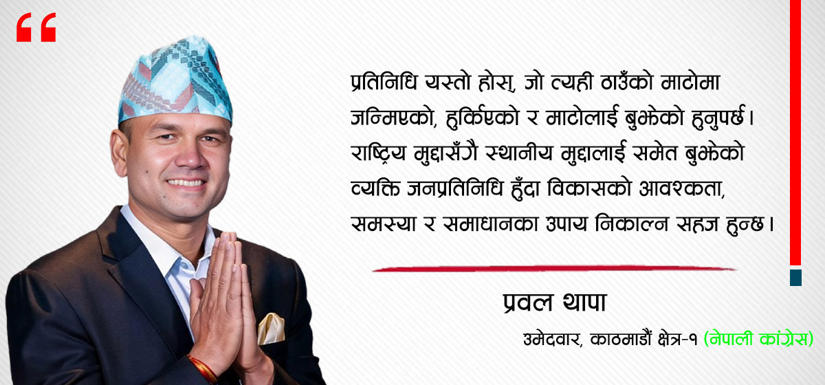 मैले तपाईंको प्रश्नमा नै आधा उत्तर भेटेको छु। काठमाडौं–१ नेपाली कांग्रेसको आधार क्षेत्र नै हो। यहाँ नेपाली कांग्रेस संगठनिक रूपमा बलियो छ। यहाँ प्रतिबद्ध कार्यकर्ताको पंक्ति ठूलो छ। भरोसायोग्य मतदाताको पनि साथ रहँदा विगतमा नेपाली कांग्रेसले लगातार जित हासिल गर्दै आएको कुरा विदितै छ।