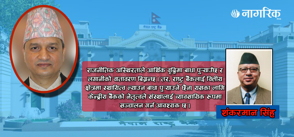 नेपाल राष्ट्र बैंक एउटा स्वायत्त संस्था हो। तर, देशले सामना गरिरहेको आर्थिक चुनौतीलाई सम्बोधन गर्न अर्थ मन्त्रालय, राष्ट्र बैंक र एनपिसी बिच समन्वय हुनुपर्छ । राजनीतिक अस्थिरताले आर्थिक वृद्धिमा बाधा पुर्याउँछ र लगानीको वातावरण बिग्रन्छ । तर, राष्ट्र बैंकलाई वित्तीय क्षेत्रमा स्थायित्व ल्याउन बाधा पु¥याउने छैन। यसका लागि केन्द्रीय बैंकको नेतृत्वले संस्थालाई व्यावसायिक रूपमा सञ्चालन गर्न आवश्यक छ ।