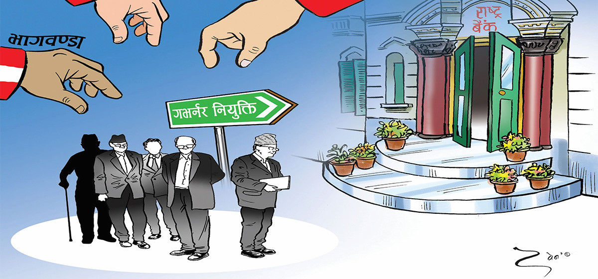 मुलुकको केन्द्रीय बैंकको गभर्नर नियुक्तिको विषय अहिले जसरी जेलिँदैछ, त्यसले अर्थतन्त्रलाई अझ अप्ठ्यारोतिर लैजान्छ। देशको अवस्था हेरेर काम गर्न सक्ने योग्य व्यक्तिलाई नियुक्त गर्ने परिपाटी बसालेको भए अहिलेको जस्तो अवस्था आउने नै थिएन। नियुक्तिमा जहिल्यै भागबन्डा गर्दागर्दा सम्पूर्ण प्रणाली विकृत भइसकेको छ।