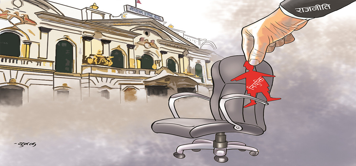 संवैधानिक अंग, आयोग, नियामक निकायदेखि लिएर महत्वपूर्ण प्रशासनिक पदहरूमा हुने नियुक्तिमा योग्यताको मापदण्डभन्दा राजनीतिक आस्थालाई प्राथमिकतामा राखेका कारण यस्तो समस्या आएको धेरैको बुझाइ छ। केही समयअघि नेपाल विद्युत् प्राधिकरणका कार्यकारी निर्देशक कुलमान घिसिङ बर्खास्तीको चर्चा सेलाउन नपाउँदै अहिले राष्ट्र बैंकमा गभर्नर नियुक्तिको भागबन्डाले बजार तताएको छ। पद रिक्त भएको लामो समयसम्म पनि राष्ट्र बैंकमा गभर्नर नियुक्ति हुन सकेको छैन।