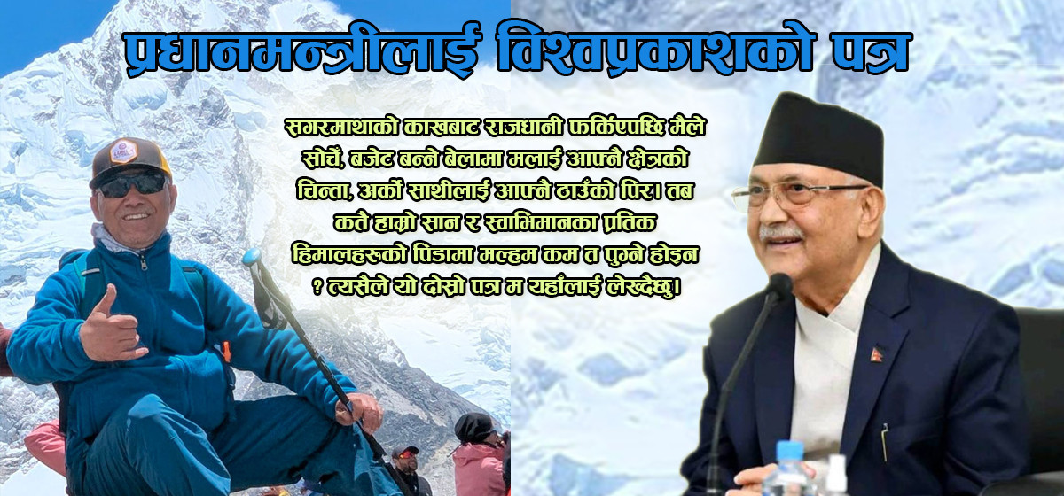 रामकृष्ण ढकालको सुमधुर स्वरमा रहेको यो गीतले हामी हरेक नेपालीको भाव बोल्छ। तर रातदिन जो हिमालमै बस्छन् नि तिनको भावले चैँ ‘सन्चले बाँच्न पाइयोस्’ भन्ने आग्रह बोलिरहेको हुन्छ । सगरमाथाको काखबाट राजधानी फर्किएपछि मैले सोचेँ, बजेट बन्ने बेलामा मलाई आफ्नै क्षेत्रको चिन्ता, अर्को साथीलाई आफ्नै ठाउँको पिर। तब कतै हाम्रो सान र स्वाभिमानका प्रतीक हिमालहरूको पिडामा मल्हम कम त पुग्ने होइन ? त्यसैले यो दोस्रो पत्र म यहाँलाई लेख्दै छु।