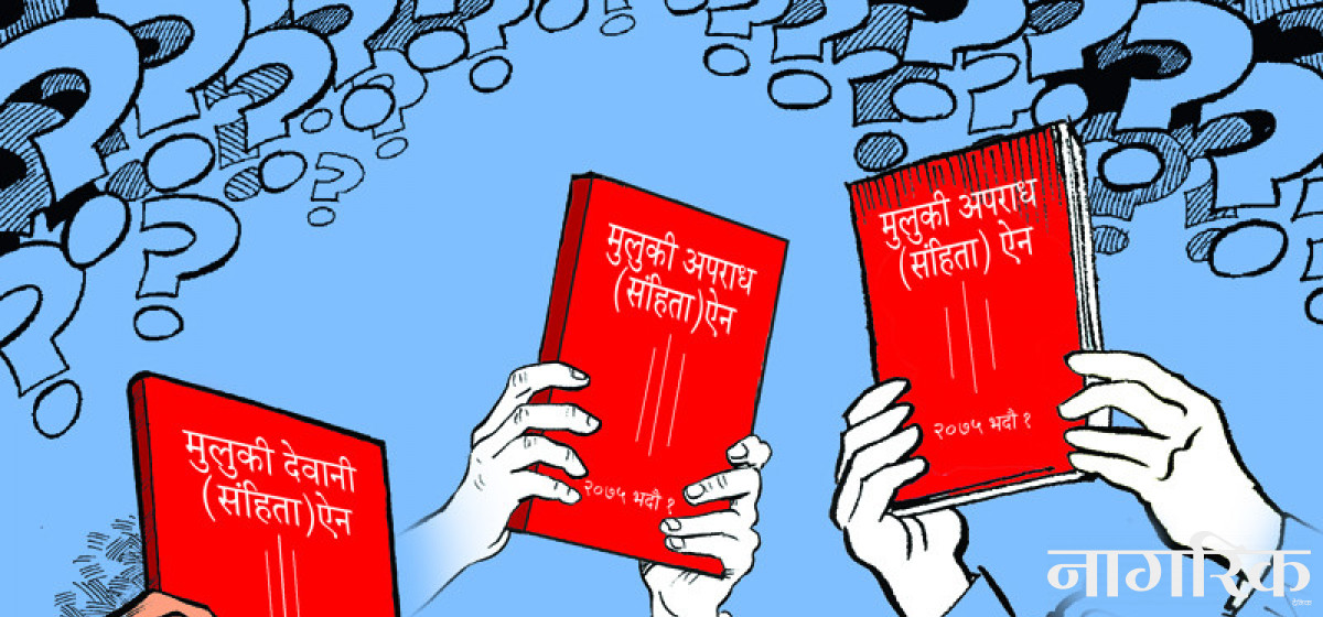 २०७५ भदौ १ गतेदेखि प्रारम्भ हुनेछ भनी प्रस्तावित मुलुकी देवानी (संहिता) ऐन, मुलुकी देवानी कार्यविधि (संहिता) ऐन, मुलुकी अपराध (संहिता) ऐन, मुलुकी फौजदारी कार्यविधि (संहिता) ऐन, र फौजदारी कसूर (सजाय निर्धारण तथा कार्यान्वयन) ऐनहरू सार्वजनिक भएका छन्। शीर्षकसम्बन्धी मान्यताबारे पछिका प्रकरणमा छलफल गरिनेछ, तर प्रारम्भमा ‘ऐन’ शब्दभन्दा अगाडि कोष्ठभित्र ‘(संहिता)’ शब्द राखिएको सम्बन्धमा चर्चा गर्नु उचित हुन्छ । (संहिता) शब्द ‘ऐन’ शब्दभन्दा अगाडि राखिएको हुँदा भाषाविज्ञानको दृष्टिमा यो शब्द ऐनकै पर्याय भन्न मिल्दैन । सामान्यतया मूल शब्द अगाडि राखिसकिएपछि त्यस मूल शब्दलाई बुझ्न असहज भएमा, वा अस्पष्ट भएमा, वा बहुअर्थी भएमा, वा विदेशी भाषामा उल्लेख गरिएकामा त्यसपछि कोष्ठमा पर्याय वा स्पष्ट पारिने शब्द राख्ने गरिन्छ । सम्भवतः मस्यौदा टोलीमा भाषाविद् नहुँदा यस्तो भाषिक त्रुटि भएको हुनसक्छ। स्मरण रहोस्, पदेन विद्वान्हरू भाषाविद् वा सबै विषयमा सर्वज्ञ हुन सक्दैनन्।