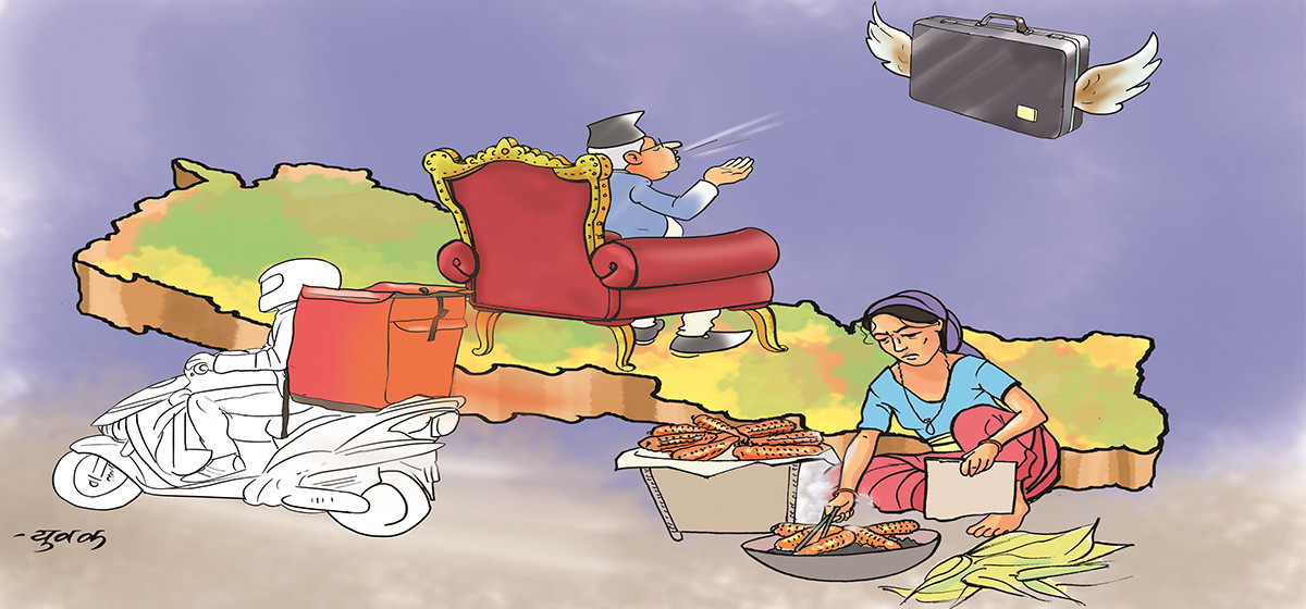 सामान्य मानिसको जीवन भने कष्टकर बनिरहेको छ। देशभित्रै उद्योगधन्दा छैनन्। तिनले विदेश जानुपरेको छ। देशमा दैनिक मेहनत गर्ने मानिसको अवस्था कहिले उक्सिने हो थाहा छैन तर केही बिचौलिया, नेता र उच्च पदस्थका लागि यो सुनको लंका हो। उपलब्धि नै उपलब्धि छन्। यस्तो अवस्थाबाट निस्किन ती राती–राती ठेलामा मकै पोलेर परिवार पाल्न खोज्ने, पठाओ वा यस्तै अन्य एपमा आधारित सवारी यात्रु ओसार्ने, दैनिक मेहनत गर्ने मानिसको जीवनमा सुधार आउन निकै कठिन छ। हामीभन्दा तल रहेका मुलुक आज हामीले नै उछिन्न कठिन हुन्छ कि भन्ने ठाउँमा पुगेका छन्। देश पछि परेकोमा चिन्ता गर्ने नेता कहिले आउलान्?