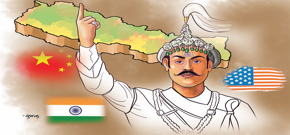 दुई सय वर्षभन्दा अगाडि पृथ्वीनारायण शाहले नेपाललाई दुई ढुंगाको तरुण भन्ने तस्बिर पेस गरेका थिए। पृथ्वीले उत्तरतिर शक्तिशाली चीनको यथार्थतालाई राम्ररी बुझेका थिए भन्ने भारतमा बढ्दो उपनिवेशवाद र यसका प्रवर्तकहरू छट्टु भएकाले उनीहरूबाट होसियार हुनुपर्ने देखेका थिए। यो चपेटामा परेको नेपाललाई बचाउन पृथ्वीले दुई देशबिचको सम्बन्धको सन्तुलित व्यवस्थापन, राष्ट्रिय सुरक्षाप्रति जागरुकता, सरकारी सुशासन र नागरिकहरू आर्थिक उन्नतिमा जोड दिएका थिए। उनको कल्पना नेपाल सबै फूल फुल्न सक्ने साझा फूलबारी हो। तर आफ्नो कल्पनालाई व्यवहारमा उतार्ने मौका अगाडि नै उनी बिते।