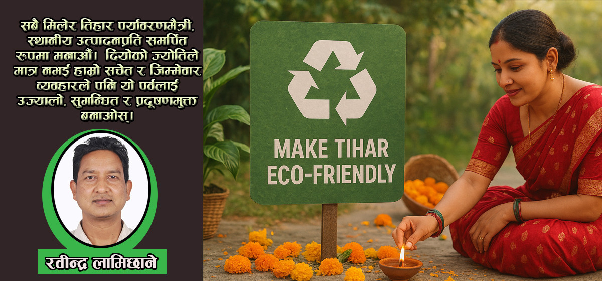 यी सबै हाम्रो सांस्कृतिक परम्पराको सबैभन्दा सुन्दर अभिव्यक्ति हुन्। यो चाड बाहिरी उज्यालो र उत्सवको मात्रै होइन, आत्मिक प्रकाश र मानवीय सम्बन्धलाई नवजीवन दिने अवसर पनि हो। तर विकासको नाममा हामीले अपनाएको ‘आधुनिक’ केही प्रथाले यस पवित्र चाडले सधैँ बोकेको शान्ति, सादगी र प्रकृतिप्रतिको सम्मान प्रदूषित गरिरहेका छन्। यस पटकको तिहारमा हामी सबैले आफ्नो पवित्र कर्तव्यका रूपमा यसलाई पर्यावरणमैत्री ढंगले मनाउने प्रतिबद्धता गरौँ।