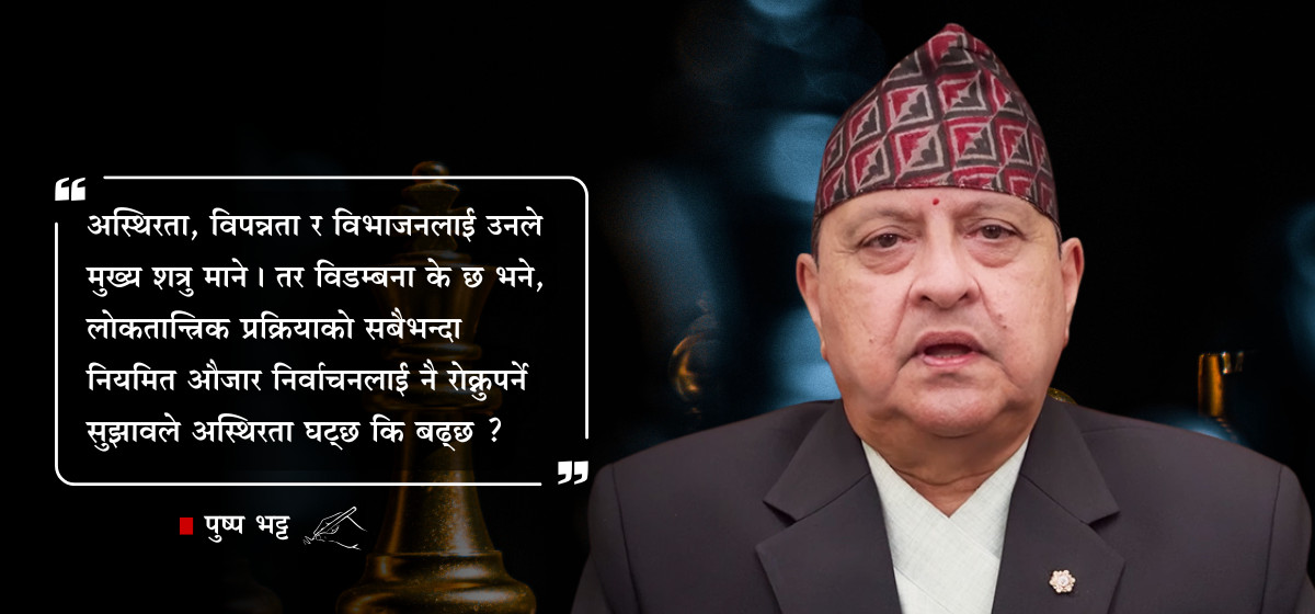 ज्ञानेन्द्रले देश अस्वाभाविक छटपटीको भुमरीमा फसेको बताए। अस्थिरता, विपन्नता र विभाजनलाई उनले मुख्य शत्रु माने। तर विडम्बना के छ भने, लोकतान्त्रिक प्रक्रियाको सबैभन्दा नियमित औजार निर्वाचनलाई नै रोक्नुपर्ने सुझावले अस्थिरता घट्छ कि बढ्छ ?