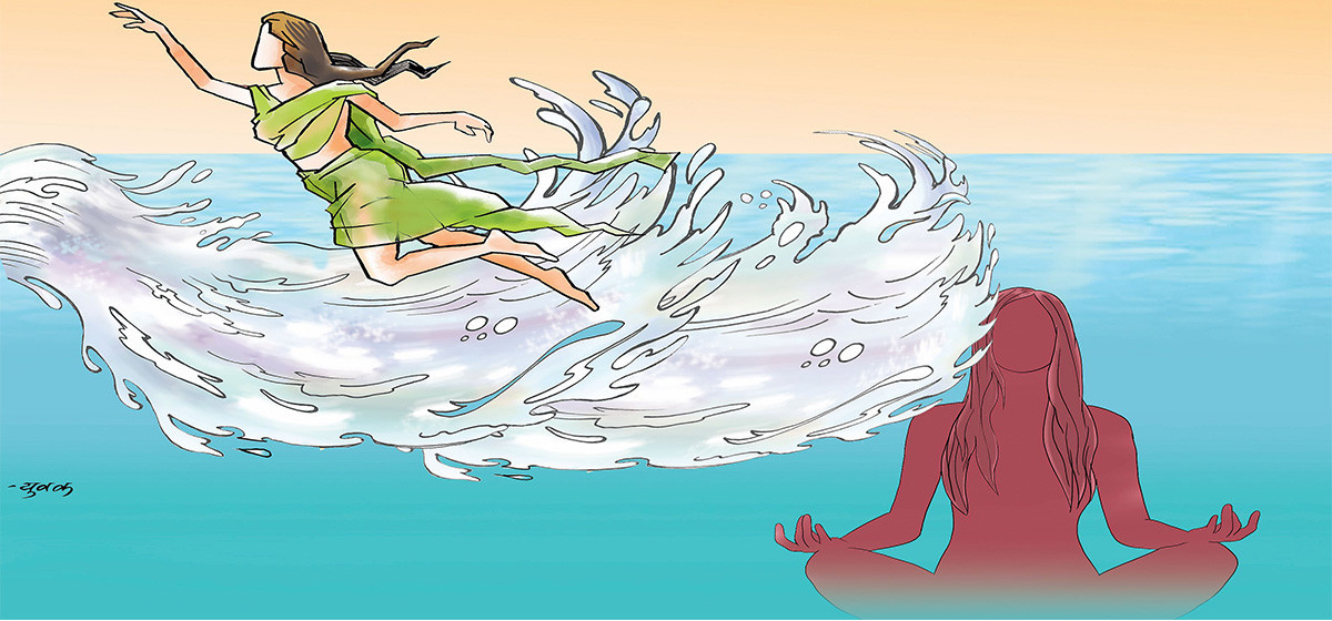 समुद्रका लहरहरू कहिले शान्त, कहिले आक्रोशित त कहिले वेगमा लहरिएको उद्दण्ड भावजस्तो महसुस हुन्छ। ठिक त्यसैगरी हामी पनि जीवनमा अनेक घटना, समस्या र खुसीका क्षणहरूको अनुभव गरिरहेका हुन्छौं। प्राकृतिक रूपमा हेर्यौं भने यो उतारचढावमा पनि सुन्दरता देख्छौं तर त्यसमा आफ्नो अपेक्षा जोडिएको छ भने जीवन आफूखुसी चलाउन मन लाग्छ। अस्तित्व उसको आफ्नो नियमले चल्छ र हामी त्यही अस्तित्वको एक अंश हौं। हामीले पनि उसको मर्जीअनुसार नचलेर सुखै छैन तर मन राजी हुँदैन। मनको स्वभाव पनि समुद्रको लहरजस्तै त हो, विचारका उतारचढावमा कथा बनाएर जीवनको अर्थ लगाउँछ। जीवनका क्षण, मनका आवेग, परिस्थितिका पहाड र तराई सबैलाई स्थिर भएर देख्ने र हेर्ने आत्मा हामीभित्रै छ। उसले हेरिरहेछ, देखिरहेछ, म बाहिर दौडिरहेछु।