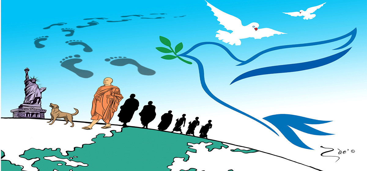 नेपाल यस्तो देश हो, जहाँ गौतम बुद्ध जन्मिएका थिए। नेपाललाई विश्व शान्तिको उद्गमस्थल भनेर चिनिन्छ। यति बेला विश्व शान्तिको सन्देश प्रवाह गर्दै अमेरिकाको टेक्ससबाट सुरु गरिएको पैदल यात्रामा ‘वाक फर पिस’ लेखिएको ब्यानर बोकेर बौद्ध धर्मावलम्बीहरूको एक समूह निस्किएका छन्। यो यात्रा तीन हजार सात सय किलोमिटर लामो छ, जुन टेक्ससबाट सुरु गरेर अन्त्यमा वासिङ्टन डिसी पुग्ने योजना छ।