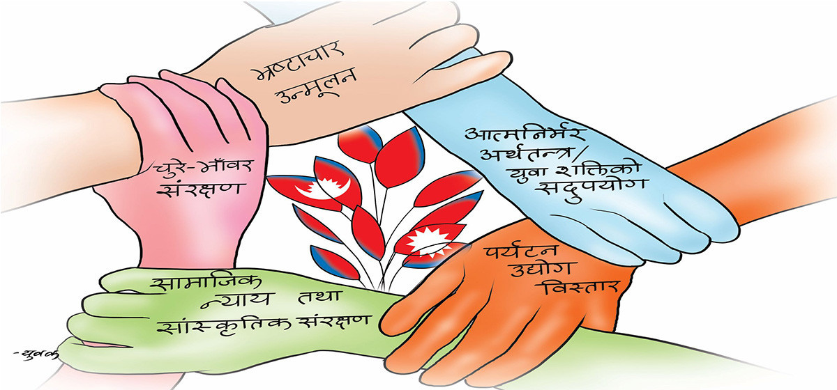 पहिलो विषय हो, स्थिर र पारदर्शी शासन प्रणालीको स्थापना। भ्रष्टाचारप्रति शून्य सहनशीलता अपनाउँदै स्वतन्त्र राष्ट्रिय अनुसन्धान आयोग गठन गर्नुपर्छ, जसले उच्च पदाधिकारीदेखि स्थानीय स्तरसम्मका भ्रष्टाचारका मुद्दाहरू छिटो र निष्पक्ष रूपमा छानबिन गरोस्। हरेक सार्वजनिक पदाधिकारीले डिजिटल रूपमा सम्पत्ति घोषणा गर्न अनिवार्य गर्नुपर्छ । कर्मचारीतन्त्रलाई चुस्त बनाउन अनावश्यक दरबन्दी कटौती, तलब वृद्धि र कामको परिणाममा आधारित बढुवाको व्यवस्था गर्नुपर्छ। दलगत ट्रेड युनियनहरूलाई खारेज गरी एउटा विकासमुखी राष्ट्रिय युनियन कायम गर्नुपर्छ। नत्र प्रशासनिक क्षमतामा ह्रासको अभिवृद्धि हुँदै गई मन्त्रालय, विभाग, कार्यालय जताततै विभिन्न दलविशेषका युनियन हाबी भएर प्रशासन क्षेत्रलाई निष्प्रभावी तुल्याइदिन कत्ति समय लाग्दैन । निर्वाचन प्रणालीलाई मिश्रित मोडल (प्रत्यक्ष र पूर्ण समानुपातिक) मा लैजाँदा मात्र स्थिर सरकार निर्माणमा सहयोगी बन्न सक्छ।
