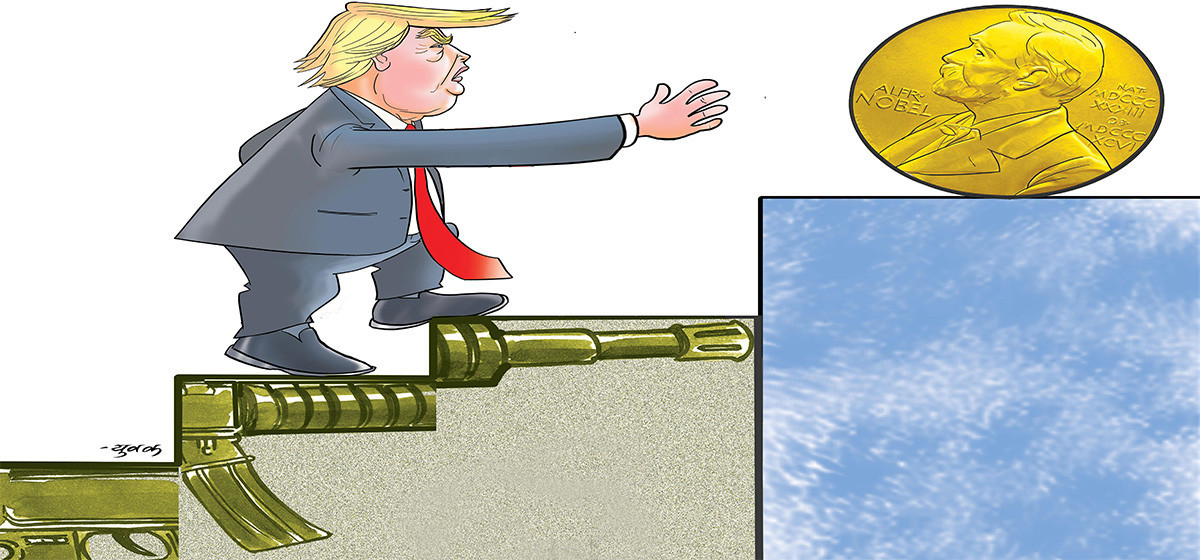 प्रसिद्ध र खासगरी महत्वाकांक्षी व्यक्तिहरूले नोबेल पुरस्कारका लागि आफ्नै पैरवी गर्नु कुनै नयाँ विषय होइन। वैज्ञानिक, अर्थशास्त्री र कविहरू समेत यसो गर्ने गर्छन्। डोनाल्ड ट्रम्पले भने नोबेल शान्ति पुरस्कारका लागि चलाएको निर्लज्ज र कल्पनातीत अभियान विश्वले अहिलेसम्म देखेको थिएन। शान्ति पुरस्कार भनेको विश्वको सबैभन्दा प्रतिष्ठित मान्यता हो, जुन शान्ति पुनस्र्थापना वा सुदृढीकरणका लागि दिइन्छ। नर्वेको संसद्ले नियुक्त गरेका प्रतिष्ठित नर्वेली विद्वान्हरू सम्मिलित एक समितिबाट यी विजेता चयन हुन्छन्। यस्तो समितिले ट्रम्पलाई पुरस्कारको लागि योग्य ठान्ला भनेर कल्पना समेत गर्न गाह्रो छ।