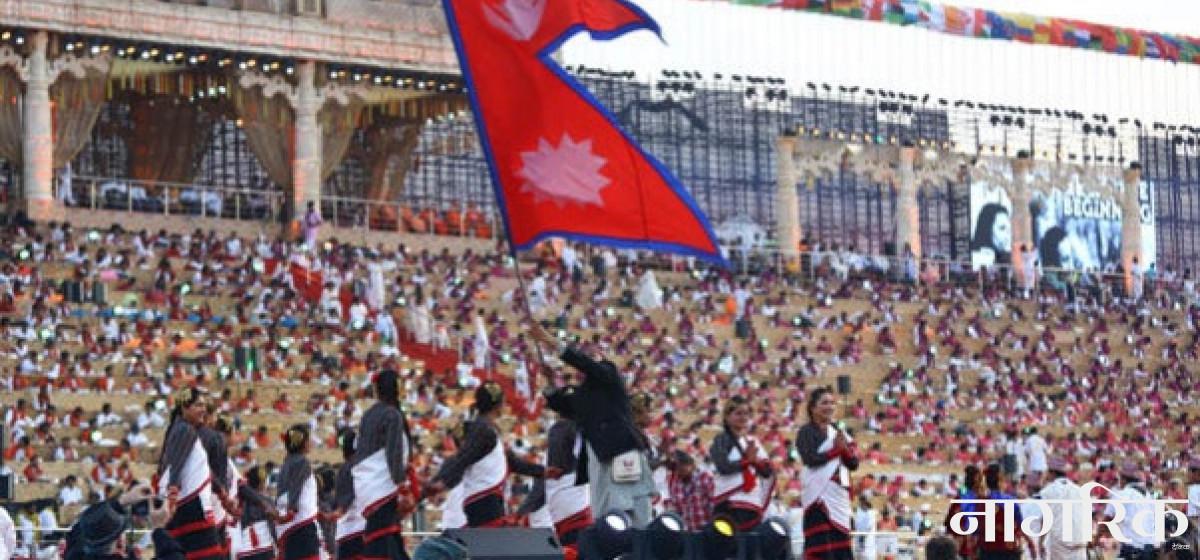 नेपालको प्रस्तुती मार्च १३ मा थियो। नेपालका एक सय २५ कलाकारको टोलीले जातजातिको मौलिक सँस्कृति देखाउने तयारी थियो। कलाकार कोही पनि व्यावसायिक छैनन्। उद्घोषकले नेपाली टोलीलाई बोलायो। भव्य स्टेज, लाखौंको नजरले हेरिरहेको।