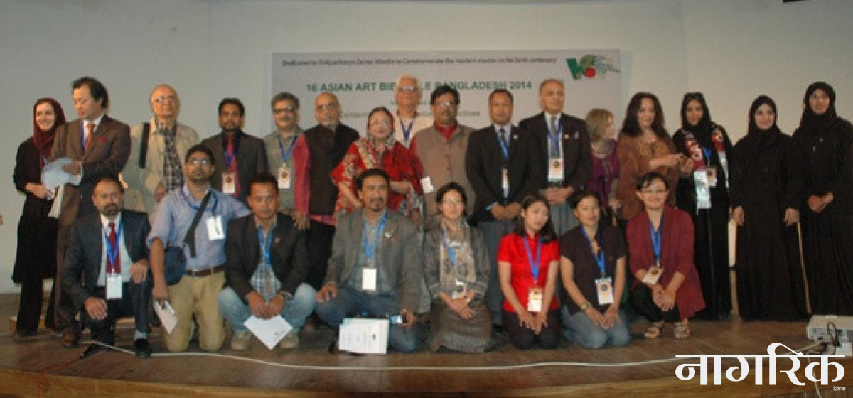 काठमाडौं- नेपाली कलाकारको टोलीले बंगलादेश शिल्पकला एकेडेमीद्वारा आयोजित १६ औं 'एसियन आर्ट बाइनाले'मा सहभागिता जनाएको छ। प्रत्येक २/२ वर्षमा हुने बाइनालेमा नेपाल ललितकला प्रज्ञा–प्रतिष्ठानका प्राज्ञपरिषद् सदस्य तथा चित्रकला विभाग प्रमुख रमेश श्रेष्ठको नेतृत्वमा कला समालोचक मदन चित्रकार, प्राज्ञसभा सदस्य लालकाजी लामा, चित्रकार सुष्मा शाक्य र मूर्तिकार विजय श्रेष्ठको टोली बंगलादेश पुगेको थियो।आयोजक राष्ट्रसहित ३२ देशका कलाकारको कलाकृति समावेश उक्त कला बाइनालेको उद्घाटन बंगलादेशका अर्थमन्त्री अबुल माल ए मुहितले गरेका थिए। बाइनालेको प्रदर्शनीम नेपालका तर्फबाट मुकेश श्रेष्ठ, धनबहादुर याखा, संगी श्रेष्ठ, हरिजंग बमजन, सुष्मा राजभण्डारी, नरेन्द्र लिम्बु, सत्यकला कसजु, ज्योतिप्रकाश विक, सुष्मा शाक्य, सुमित्रा लामा, पञ्चलाल श्रेष्ठ, सूर्य बराइली, उमेश श्रेष्ठ, लालकाजी लामा, विजय श्रेष्ठ, विवेक मुकारुङ र रमेश श्रेष्ठका चित्रकला र मूर्तिकला सहभागी गराइएको थियो।