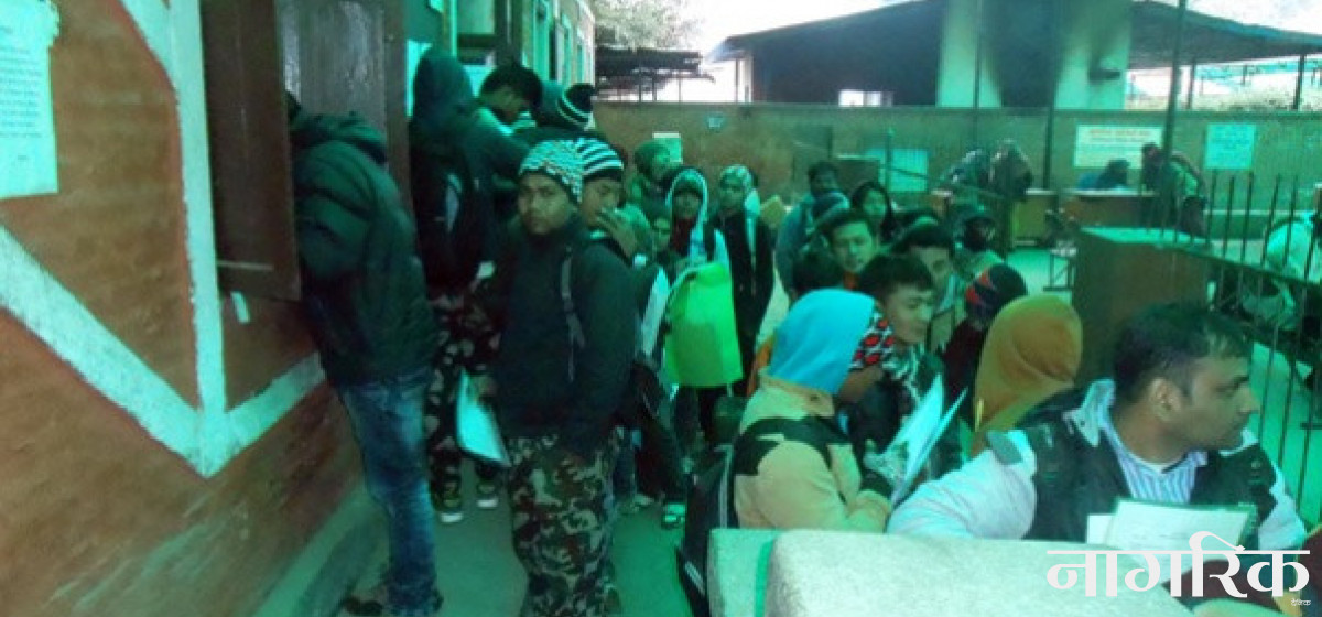 राहदानी विभागको मुख्य गेटबाहिर सर्वसाधारणको घुइँचो थेग्न प्रहरीलाई हम्मे परिरहेको छ। अधिकांशका हातमा राहदानी फारम छन्। उनीहरू लाइनमा कोचाकोच गर्दैछन्। पुसको कठ्यांग्रिने जाडोमा शीतले अनुहारै चिन्न मुश्किल परिरहेको छ। ठन्डी छल्न बाक्ला कपडा लगाएका उनीहरू आँखा मिच्दै सोध्दै छन्, 'दाइ, फारम बुझाउने कता?'