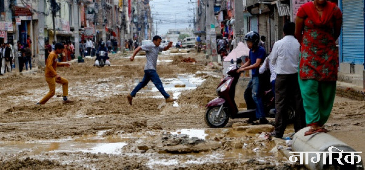 वर्षा सुरु भएसँगै राजधानीवासीले भोग्ने अर्को समस्या हो— हिलो। पानी नरोकिएसम्म हिलोको मार र घाम लाग्न थालेपछि धुलो। सडक विस्तारको काम पूरा नहुँदा राजधानीका कतिपय ठाउँको दृश्य असारमा धान रोप्न तयार पारिएको खेतभन्दा कम छैन। केही ठाउँको बाटो देख्दा लाग्छ, सडक होइन खहरेमाथि गाडी गुडिरहेको छ। मूलपानी, गोठाटार, जोरपाटीका भित्री सडक त्यसका पर्यायमात्र हुन्।