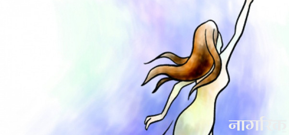 केहीपर निलो रङको घर टक्क उभिएको थियो। निलो अर्थात् शान्तिको प्रतीक। शान्ति मनमा हुनुपर्छ भन्ने गरिन्थ्यो। तर मनमा शान्ति ल्याउन रङहरूको भूमिका ठूलो हुँदो रहेछ। ऊ यस्तै यस्तै सोचिरहेको थियो। त्यसै बेला घरको माथिल्लो तलामा टाँगिएको पर्दा उघि्रयो। उसका आँखा झ्यालभित्र मोडियो। कपाल सपक्क पछाडि बाँधेको, सेतो कुर्ता–सलवार लगाएकी एक युवतीको धूमिल अनुहार उसको आँखाअगाडि देखा परे। युवती कापीमा केही कोरिहेकी थिई। ऊ निक्कै बेर घोत्लिई, केही लेखी, पानी पिई र फेरि लेख्न थाली। आफू बसेर लेख्दै गरेको टेबुललाई वर तानी, सिलिङतिर आँखा फकाई। त्यसपछि उसको हातमा नाइलनको डोरी देखियो। छिटोछिटो त्यसलाई सिलिङमा बाँधी। त्यसपछि कसिलो मुठी पारेर एक छिन त्यहीँ अडिई। केही सोचेझैं गरेर सिलिङमा बाँधिएको डोरी घाँटीमा लगाई। आफू उभिएको टेबुललाई लात मार्न खोजी तर सकिन।