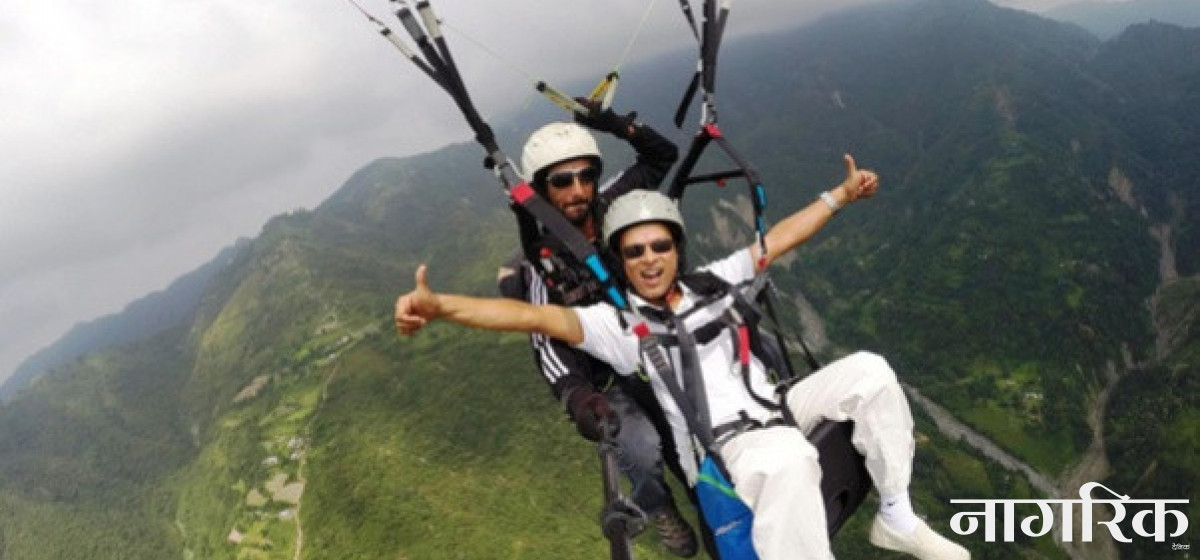 अघिसम्म बस्ने झोलालाई भ्याप्प समातेका मेरा हात पंक्षीको पखेटाझंै आकाशमा कावा खाँदै थिए। पाइलटले दुवै हातले डोरी खेलाइरहनुपर्ने, हावाको गतिअनुरूप। इन्जिनविनाको 'यान' भन्दा पनि फरक नपर्ने।
