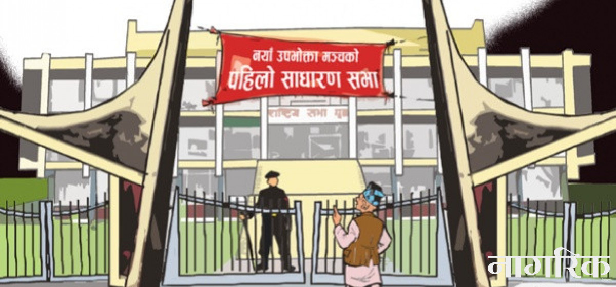 गोविन्दबाबु घुम्दैघुम्दै राष्ट्रिय सभागृहको गेटमा पुग्यो। रातो कपडामा सेतो अक्षरले 'नयाँ नेपालको नयाँ उपभोक्ता मञ्चको पहिलो साधारण सभा' लेखिएको थियो। ब्यानर हेरेर भन्यो, 'कस्तो ब्यानर? कुनै पनि पार्टीको झन्डा राखेका छैनन्।'